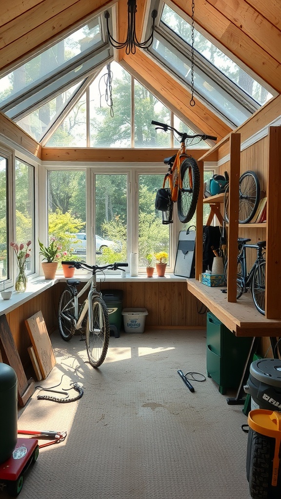 Here, you see bicycles neatly arranged. One hangs from a wall, while another stands on the floor, giving the room a casual and functional vibe. Wooden shelves hold tools and accessories, making everything easy to access whenever you need them.