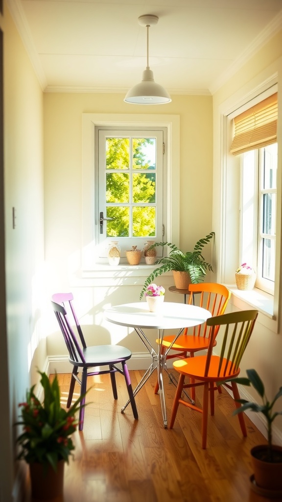 This charming breakfast corner radiates warmth and cheer. The sun shines in through the window, highlighting colorful chairs that add a playful touch to the space. Each chair has its own unique color, creating a lively setting that invites you to sit and enjoy a meal.