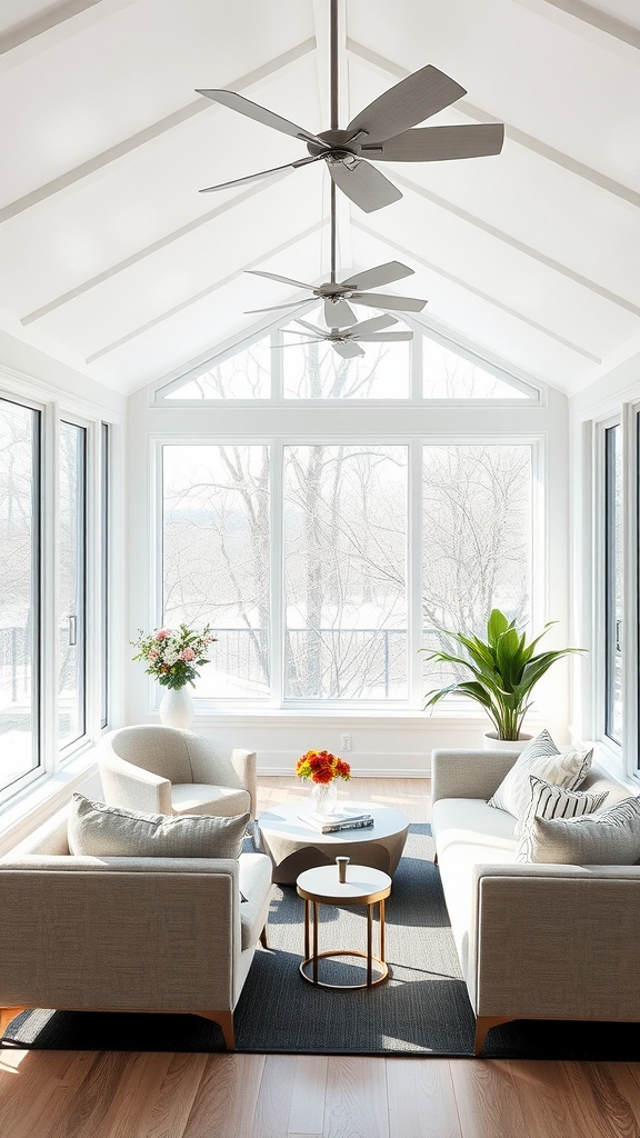 A contemporary minimalist sunroom can be a delightful escape. Picture a bright space filled with natural light, where relaxation comes easy. This image shows a cozy setup with sleek furniture that invites you to sit back and enjoy the view.