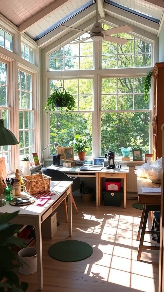 A sunroom is the perfect spot for a crafting corner. This image showcases a bright and welcoming workspace that benefits from plenty of natural light. Large windows and a skylight let in sunshine, creating a cheerful atmosphere.