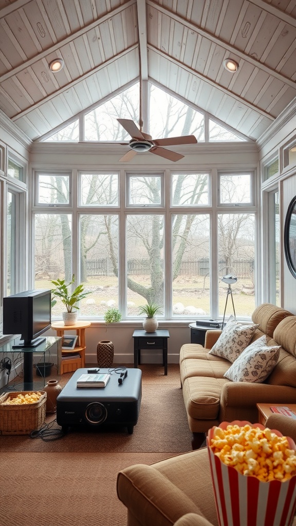 Imagine turning your sunroom into a cozy movie theater. The image shows a bright, inviting space with large windows bringing in natural light. This setup is perfect for movie nights.