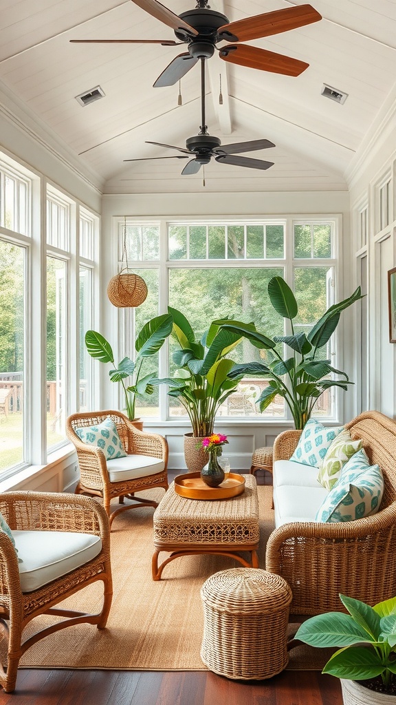 The use of natural materials, like wicker furniture and potted plants, enhances the room’s eco-friendly vibe. Plants not only beautify the space but also improve air quality, making this sunroom a perfect spot for relaxation or reading. A few well-placed tables and cozy seating invite you to unwind and soak up the sun.