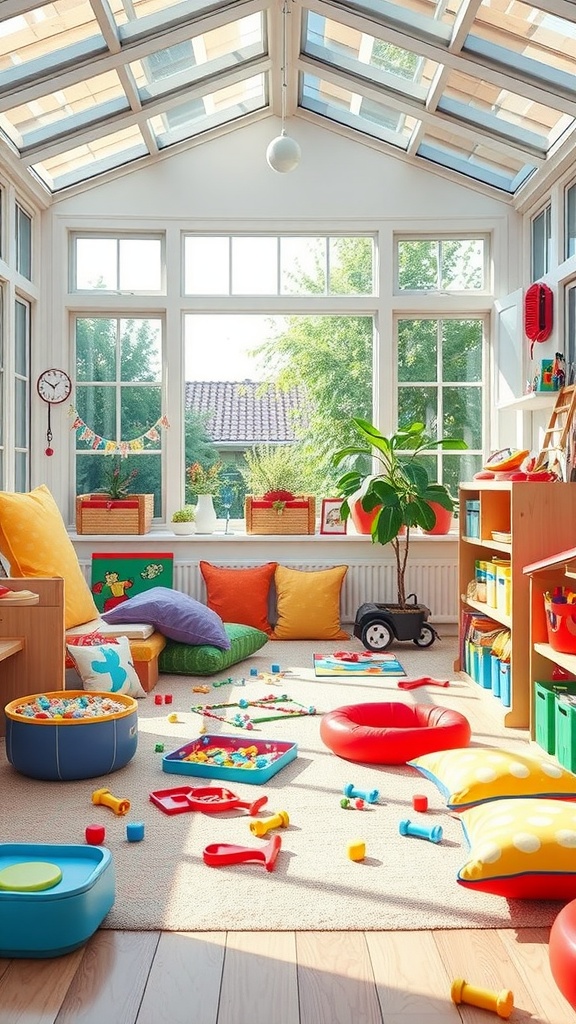 A sunroom can be transformed into a cheerful playroom for kids, filled with light and color. Large windows allow natural sunlight to flood the space, making it inviting and bright. The view outside adds a touch of nature, perfect for sparking imagination.