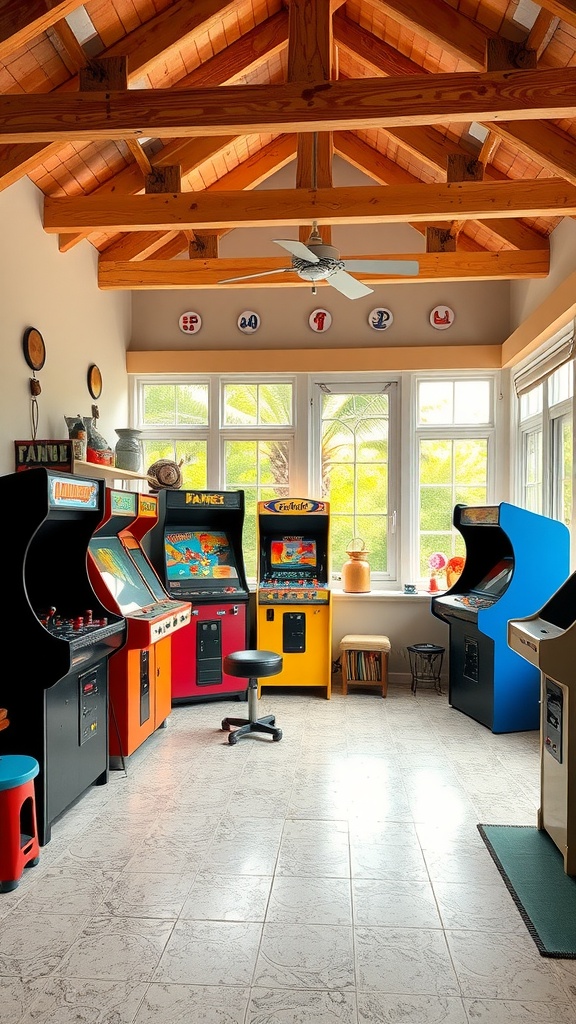 Transforming a sunroom into a retro game room is a fantastic idea! Imagine walking into a space filled with colorful arcade machines. The image captures a bright, airy room featuring classic gaming cabinets in shades of black, red, yellow, and blue. These machines take you back in time, offering a nostalgic vibe that can’t be beaten.