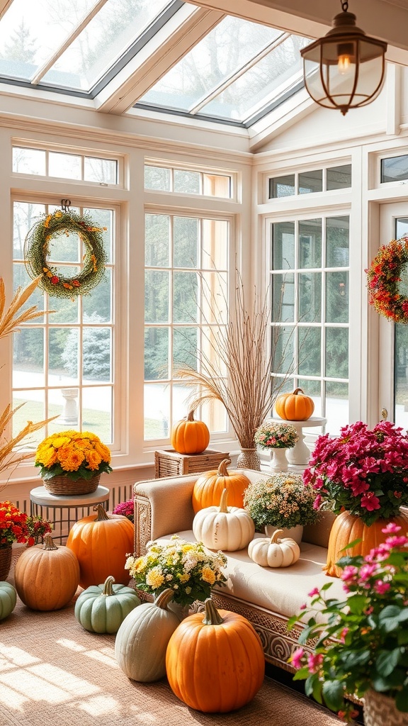 Transforming your sunroom into a seasonal wonderland can be such a joy. This image showcases a delightful fall setup, bursting with color and warmth. The rich oranges, whites, and greens of the pumpkins blend beautifully with vibrant floral arrangements.