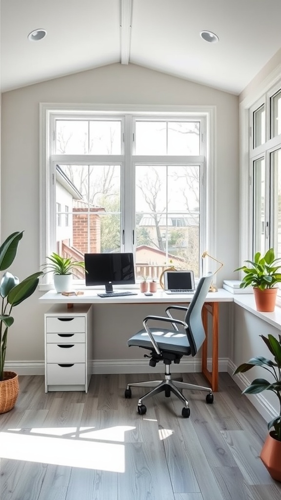 The desk setup is simple yet functional. A sleek chair and a minimalist desk provide comfort without overwhelming the space. Having plants around adds a touch of nature, which can be refreshing during long work hours.