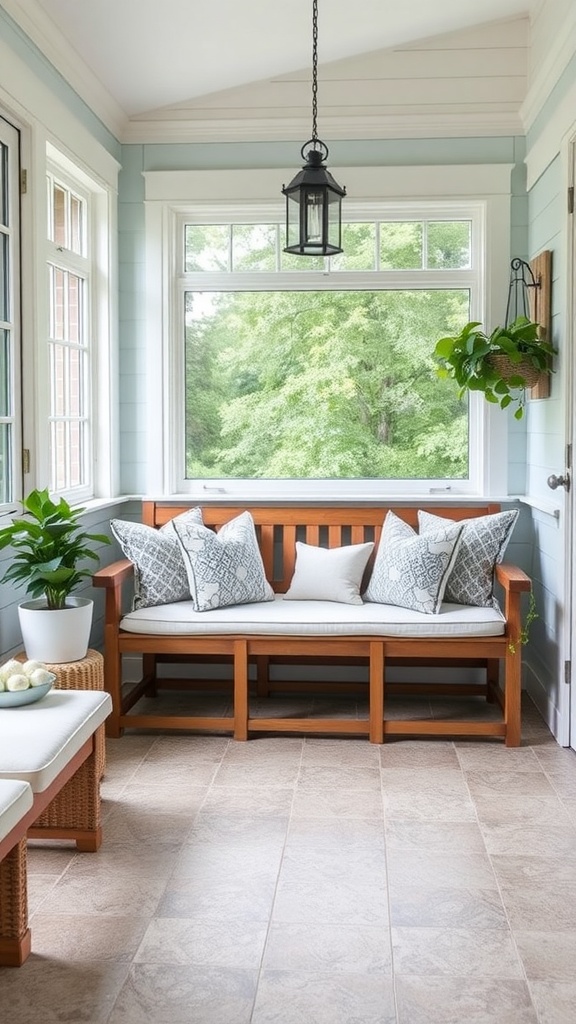 Adding decorative pillows with patterns can personalize the bench, making it more than just a seating area. A small table beside the bench can hold drinks or snacks, making it a great spot for informal gatherings. This setup encourages relaxation and enhances the overall charm of the sunroom.