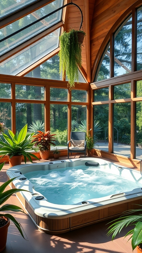 A sunroom with a hot tub creates a cozy retreat right in your home. This setup combines the warmth of natural light with the soothing experience of a spa. The large windows let in plenty of sunshine, making the space feel open and inviting.