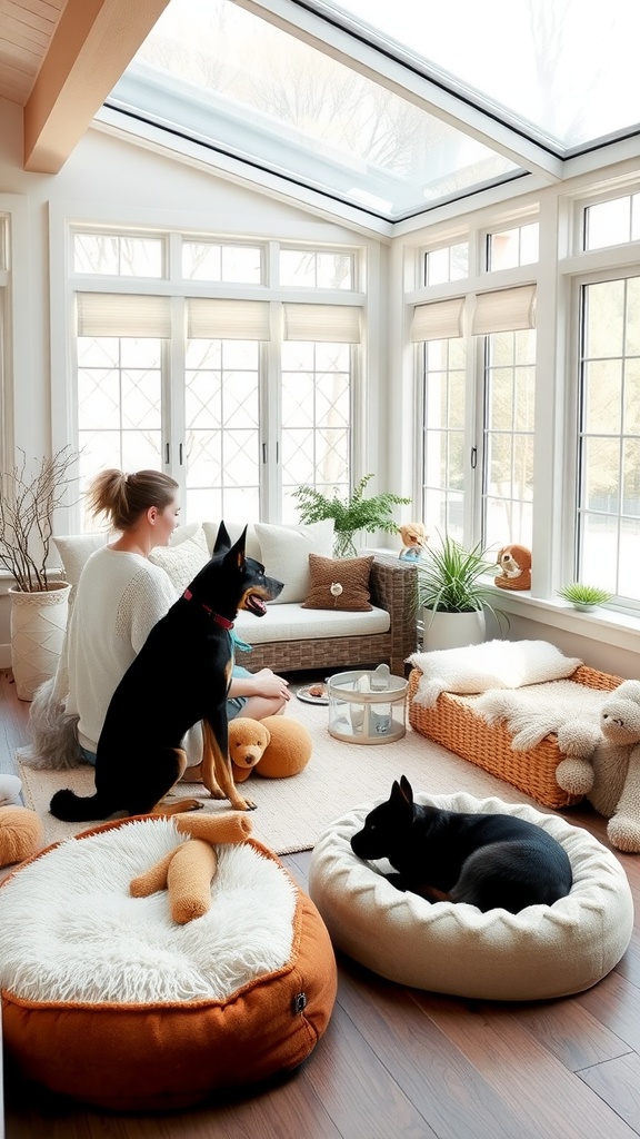 In the sunroom, there are plush pet beds and toys scattered about. This design choice not only makes it comfy for pets but also adds a playful touch to the room. The soft textures of the bedding and the cute plush toys create an inviting atmosphere that pets will love.