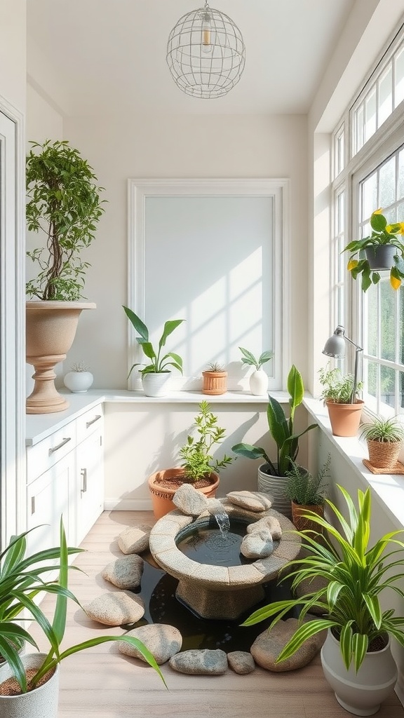 The plants around the fountain contribute to the fresh feel of the space. From tall leafy greens to smaller potted herbs, they bring life into the room. Each plant choice enhances the overall aesthetic. The mix of textures, from the rocks to the foliage, creates a visually interesting environment.