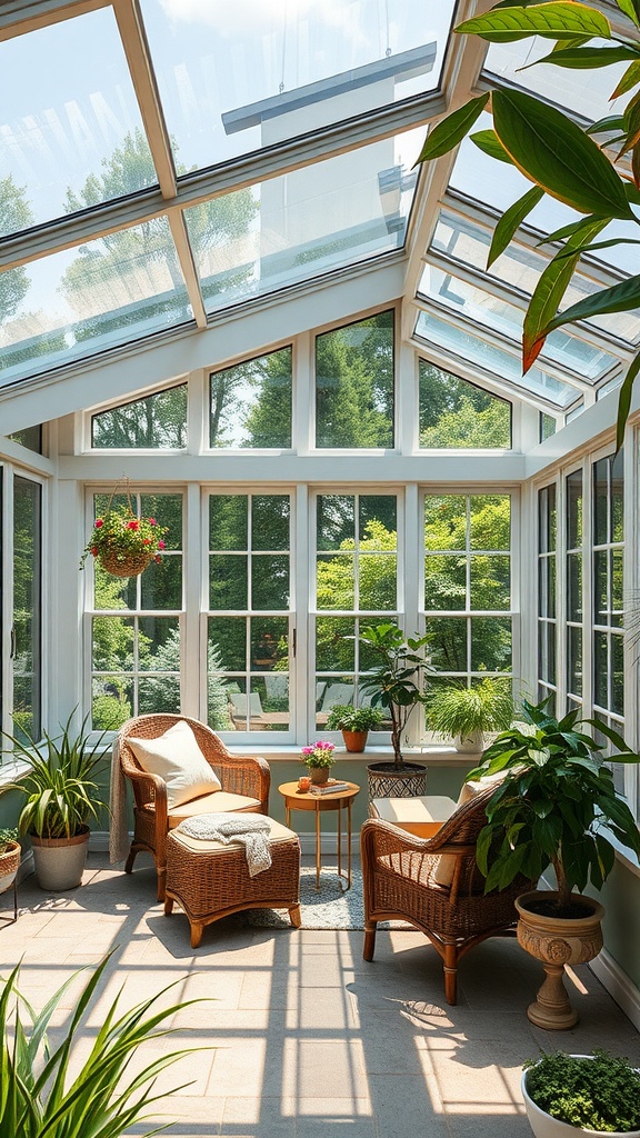 A sunroom is a fantastic addition to any home, especially when it emphasizes sustainable living. This image shows a bright, airy sunroom filled with lush greenery and natural light. The large windows and glass roof allow sunlight to flood the space, creating a warm and inviting atmosphere.