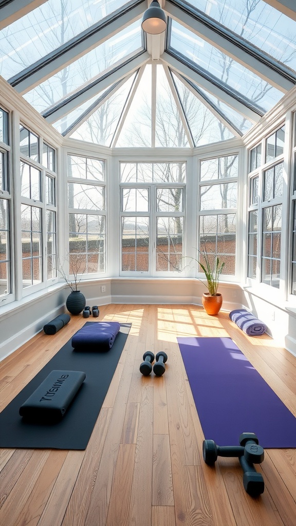 Creating a yoga and fitness space in your sunroom can be a great way to stay active and enhance your well-being. The image showcases a bright, airy room filled with natural light, perfect for peaceful practices like yoga or meditation.
