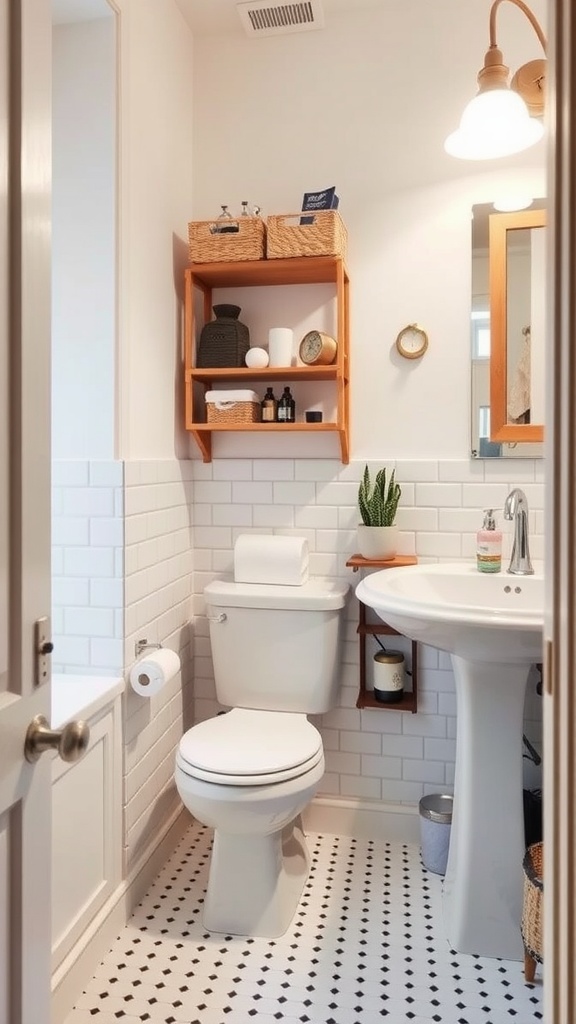 Every detail, from the patterned floor tiles to the thoughtful placement of essentials, shows that a small bathroom can be both beautiful and practical.
