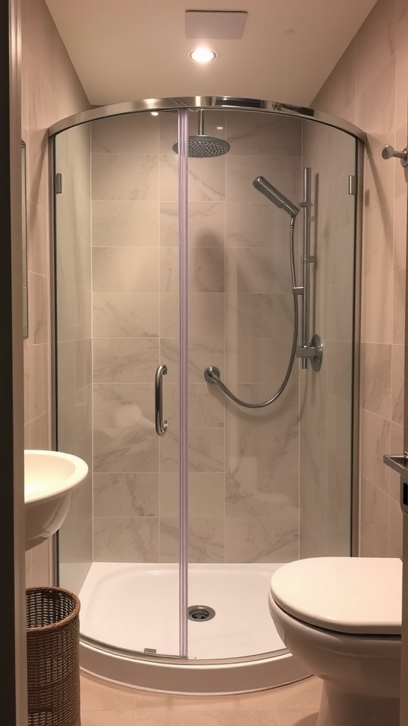 Glass shower enclosures are a fantastic choice for tiny bathrooms. They create an illusion of space while keeping the area sleek and modern. The image shows a beautifully designed corner shower with clear glass panels. This design allows light to flow freely, making the bathroom feel larger and more open.
