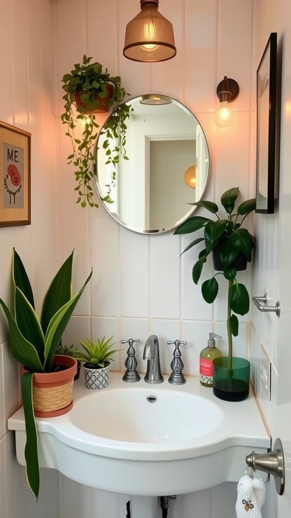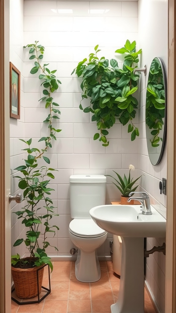 Plants can completely transform a tiny bathroom, giving it a fresh and inviting feel. In the image, we see a small space filled with greenery that makes it feel lively. The vines climbing the wall and the potted plants near the sink create a warm, welcoming atmosphere.