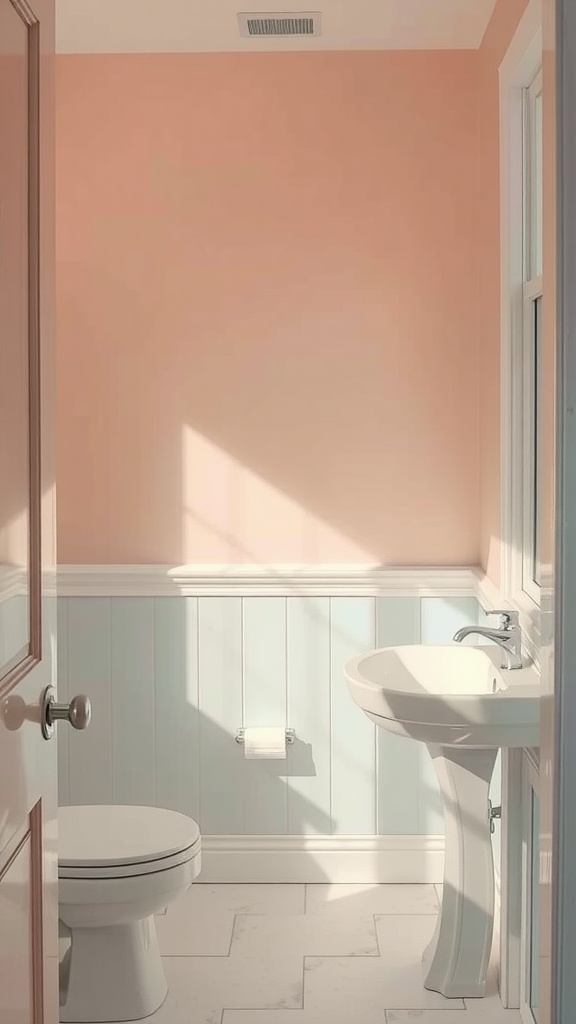Using light colors in a small bathroom can create an inviting and airy feel. The image shows a lovely combination of soft peach and pale blue hues. These shades reflect light beautifully, making the space appear larger than it is.