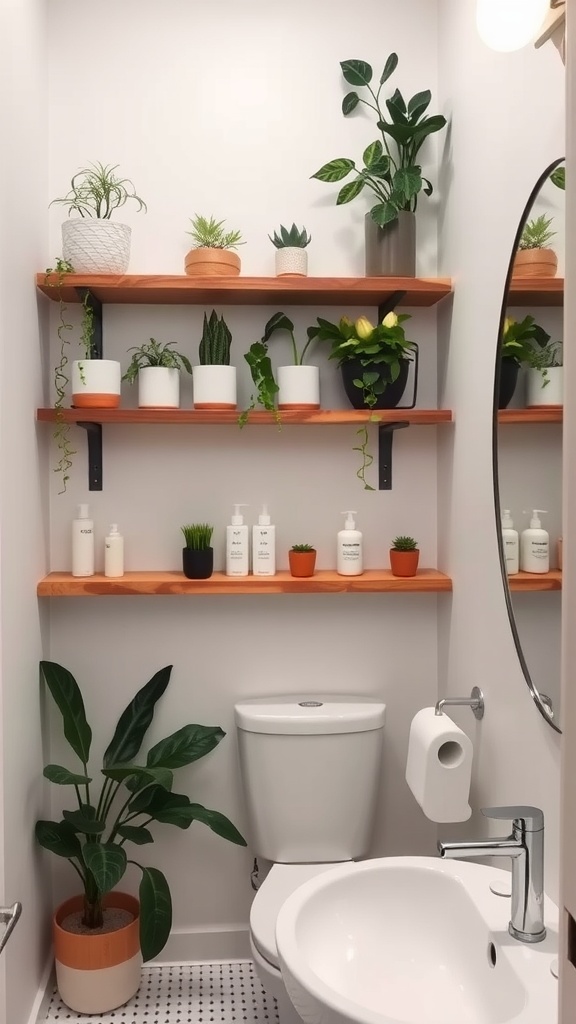 When dealing with tiny bathrooms, vertical space is your best friend. The image shows a smart use of wall-mounted shelves that not only add storage but also bring life into the space. The wooden shelves hold a variety of plants and bottles, creating a fresh and inviting atmosphere.