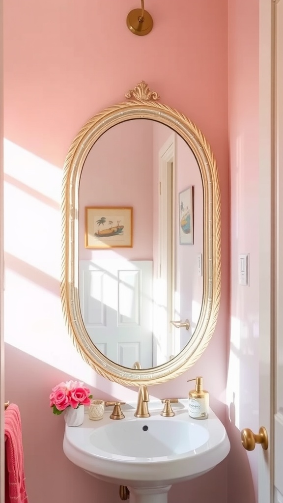 Mirrors are a fantastic addition to any tiny bathroom. They can make the space feel larger and brighter. In the image, we see a beautifully framed mirror that catches the eye immediately. The ornate gold frame adds a touch of elegance, while the simple sink below keeps the focus on the mirror.