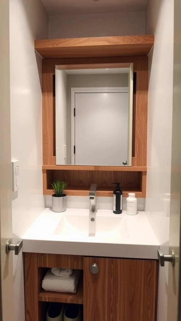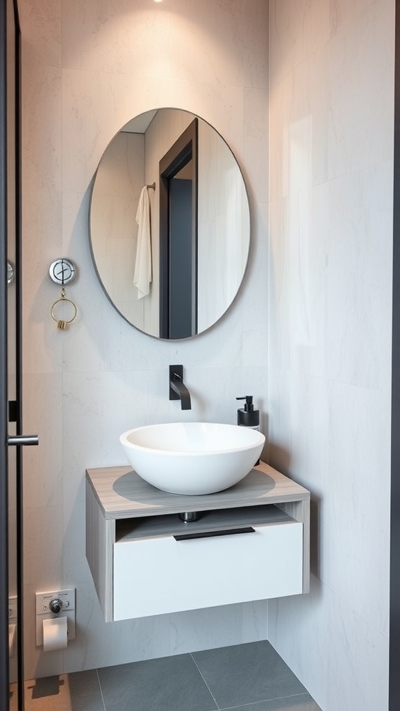 When dealing with a tiny bathroom, every inch counts. This image showcases a smart space-saving vanity design that maximizes functionality without sacrificing style. The wall-mounted cabinet offers a clean look while providing essential storage.