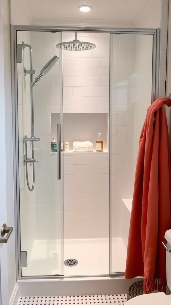 When dealing with a tiny bathroom, every inch counts. Niche shelving is a smart way to store shower essentials without cluttering the space. In the image, you can see a sleek shower setup with built-in shelving. This design maximizes space and looks tidy.