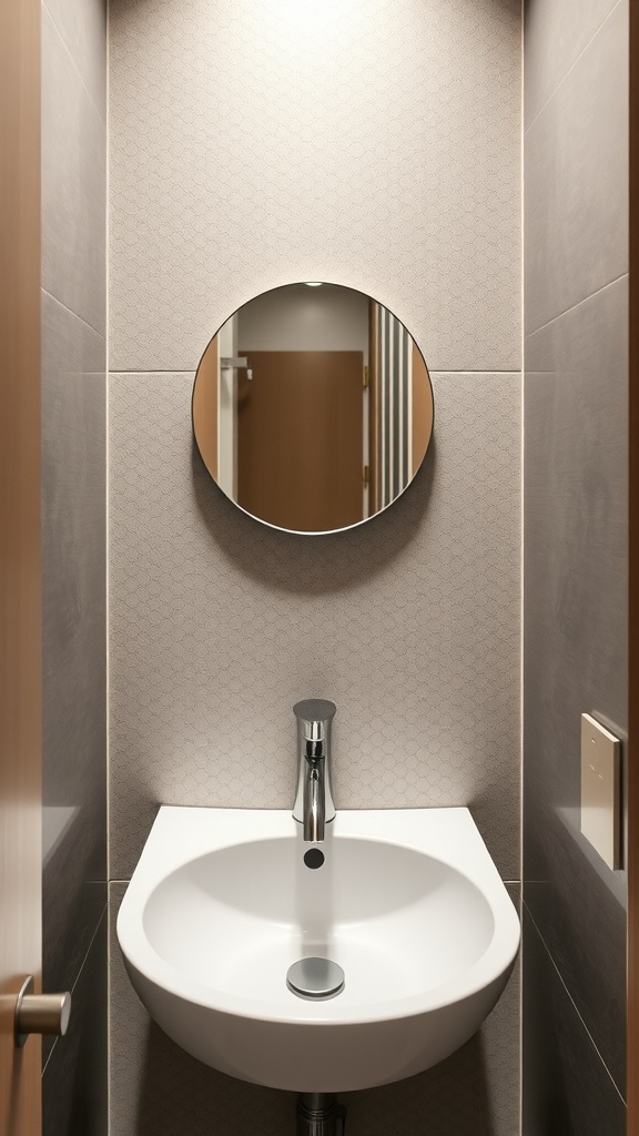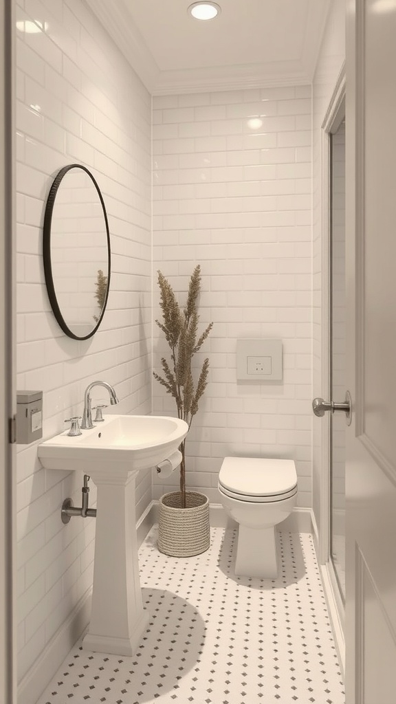 A sleek pedestal sink and a modern toilet maintain that minimalist look, ensuring the space doesn’t feel cluttered. The round mirror adds depth, reflecting light and creating the illusion of more space.
