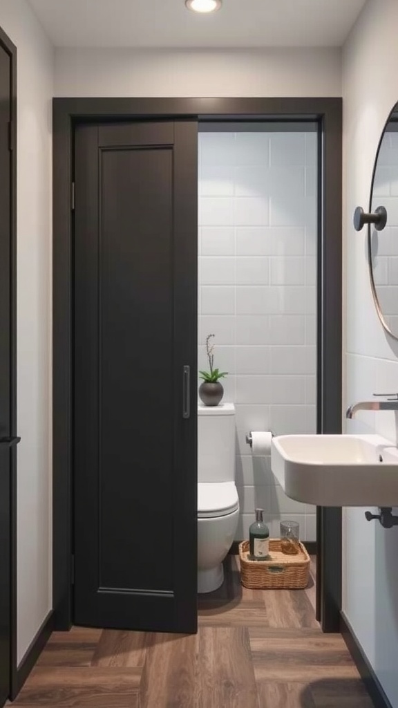 The dark door contrasts nicely with the lighter walls, creating a modern look. With this design, you can save precious floor space that traditional doors would require when swinging open.