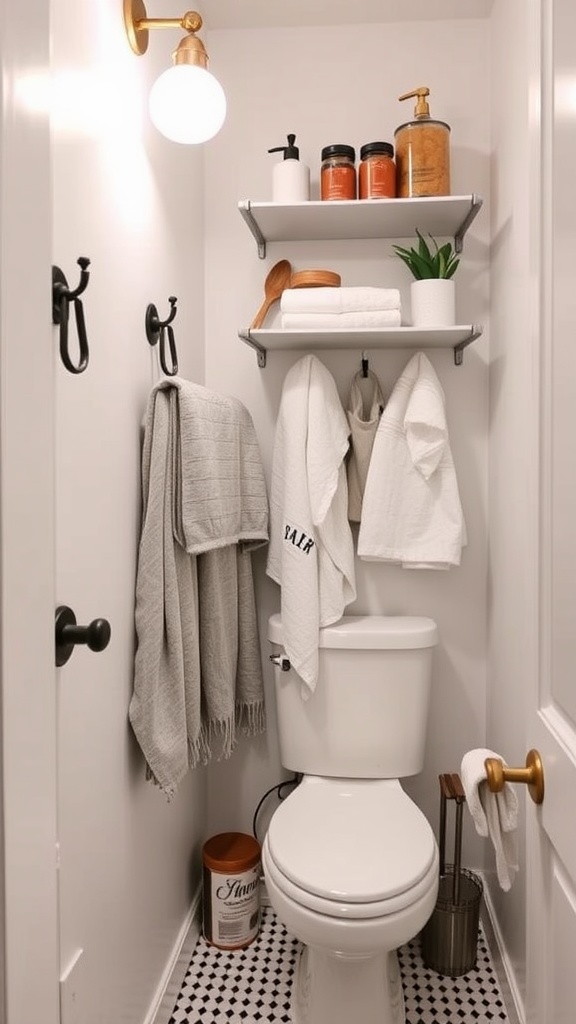 When it comes to maximizing space in a tiny bathroom, hooks and racks are your best friends. The image shows a well-organized bathroom area that perfectly illustrates this idea. Notice how the two wall hooks effortlessly hold towels, adding both functionality and style to the space.