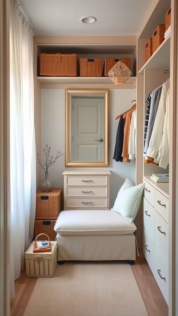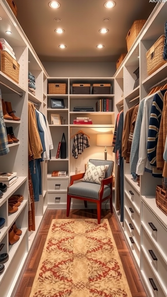 Your walk-in closet can serve as a delightful reading nook. Just picture a soft chair tucked away amidst your favorite clothes and books. The plush chair in the corner invites you to unwind, while a simple rug adds warmth to the space.
