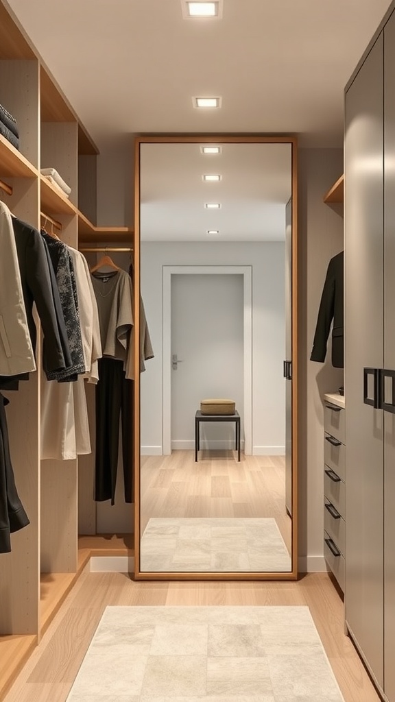 The image showcases a spacious closet featuring a stylish full-length mirror framed in wood. This design seamlessly blends with the overall aesthetic, creating a clean and organized look. You can see how the mirror adds depth and brightness to the space, making it feel even more inviting.