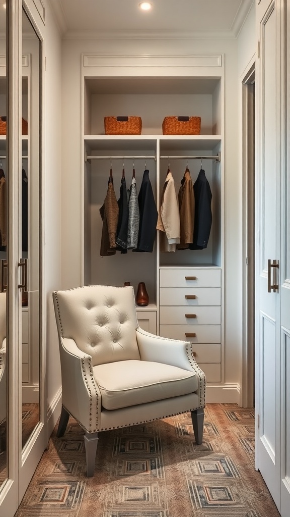 The image shows a chic, tufted chair in a light color. It stands out against the neutral backdrop of the closet. This blend creates a welcoming vibe. The chair’s design complements the modern elements of the space while also being functional.