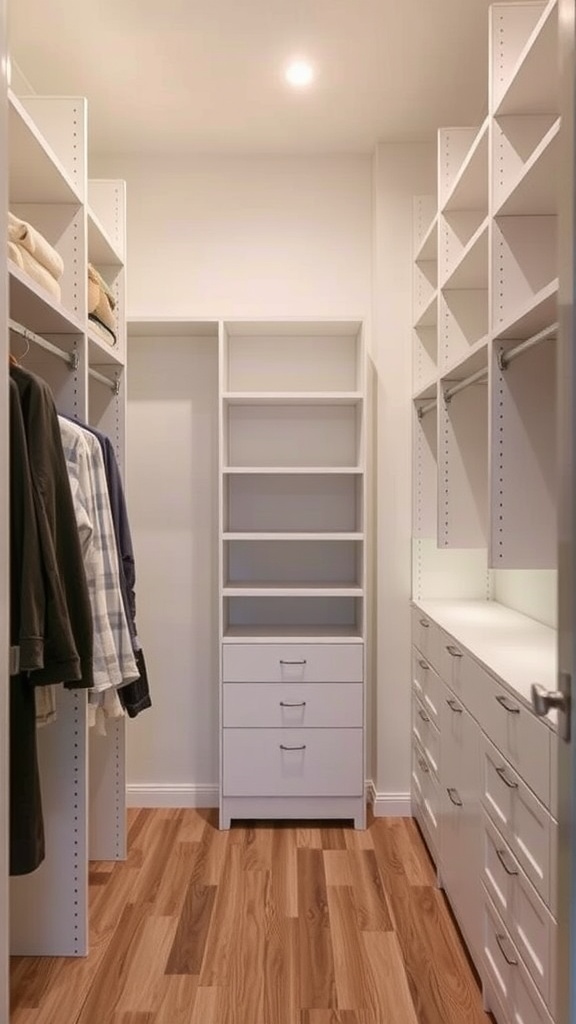 Creating a walk-in closet that fits your style and needs can be really fun. Custom shelving is a great way to make the most of your space. The image here shows a clean and modern design with plenty of shelves and drawers.