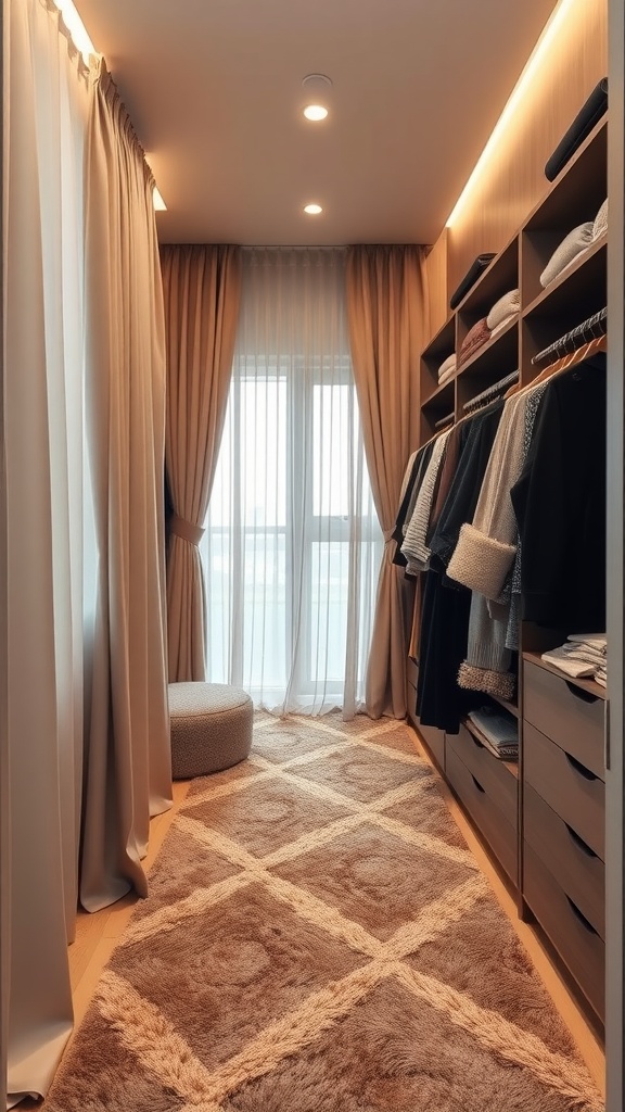 The plush, fluffy rug on the floor brings a cozy feel, encouraging you to step inside and enjoy the space. It’s like a little slice of comfort amidst your daily routine. The combination of the rug and curtains creates a pleasing contrast with the sleek wooden shelves holding neatly arranged clothes.