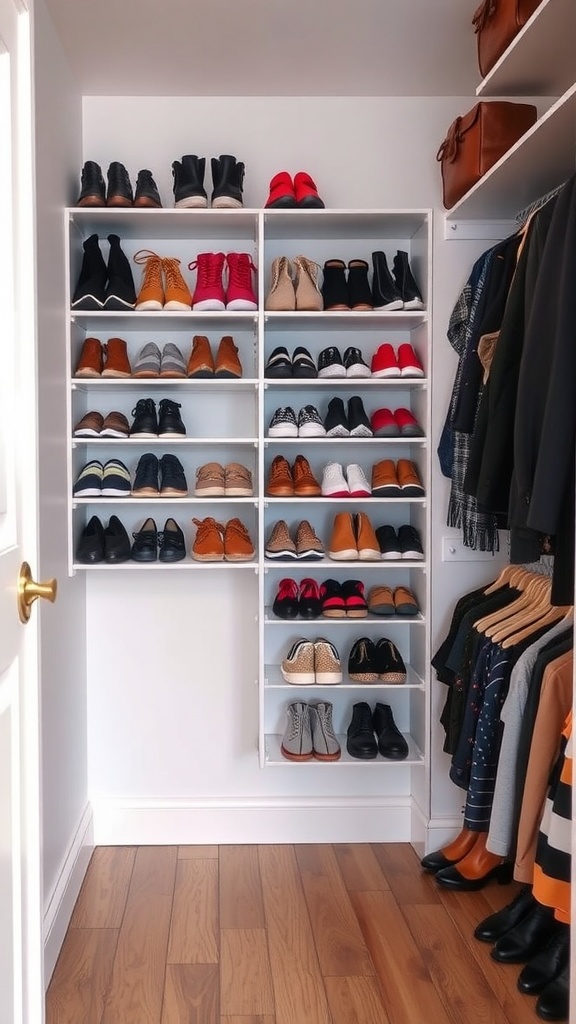 The layout here uses multiple shelves to maximize space. This design allows for different shoe types, from boots to sneakers, to coexist harmoniously. Opt for adjustable shelves if you have varying heights of footwear. Keeping shoes in clear view helps you choose the perfect pair quickly.
