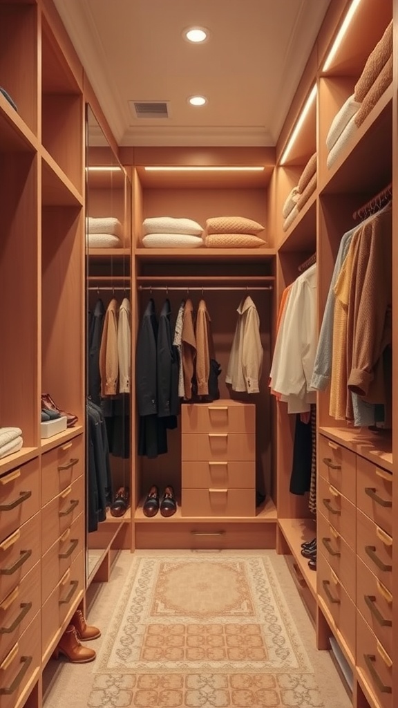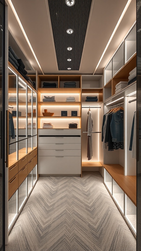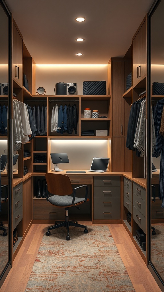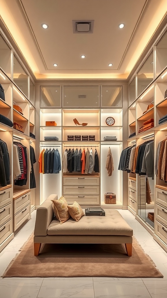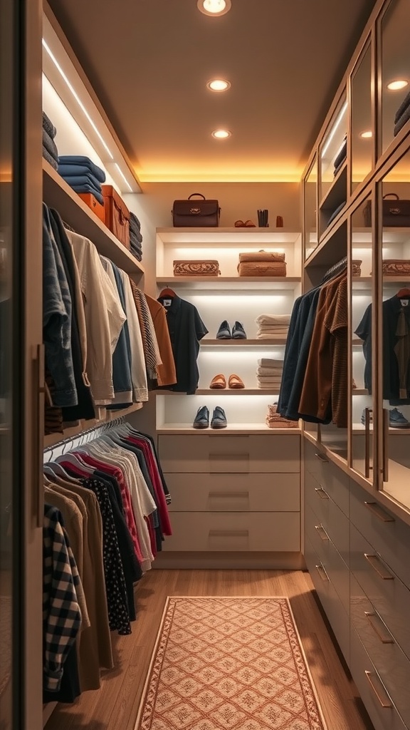 Plus, the mirrored cabinets on the side give you a full view of your outfit options. The soft lighting overhead adds a warm glow, making the space feel inviting. Incorporating such elements can turn your closet into a personal oasis, where getting ready becomes a pleasure.