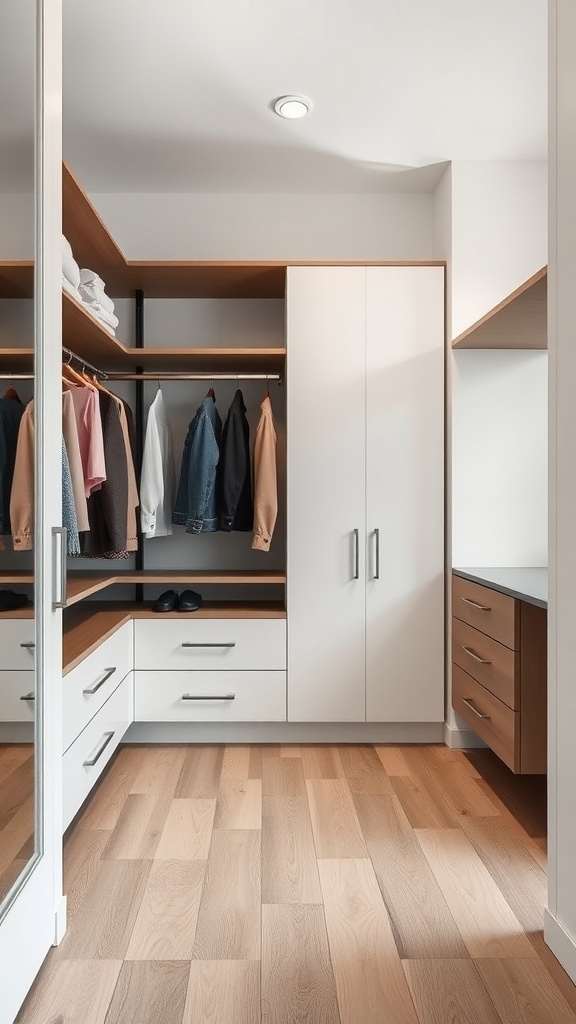 Combining open and closed storage in a walk-in closet can really enhance both functionality and style. In the image, you can see a well-organized space with a mix of both types of storage. The open shelving allows you to display folded clothes and accessories, making it easy to grab what you need at a glance.