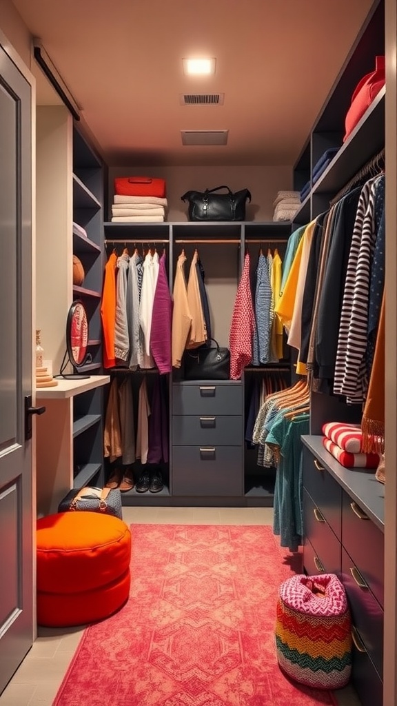 Bright colors can bring life to any space, and a walk-in closet is no exception. In the image, we see a cozy closet layout, where vivid hues make it feel inviting and fun. The bright orange pouf and patterned rug stand out, adding a playful touch to the overall aesthetic.