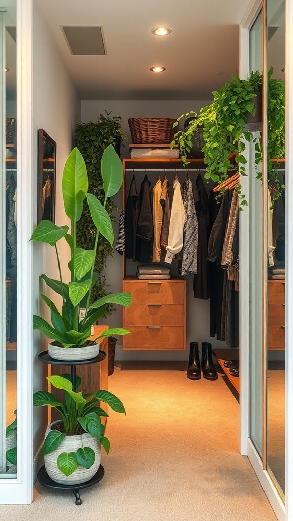 Bringing plants into your walk-in closet adds a fresh touch and creates a lively atmosphere. The image shows how simple greenery can transform a space that might feel purely functional into something warm and inviting.