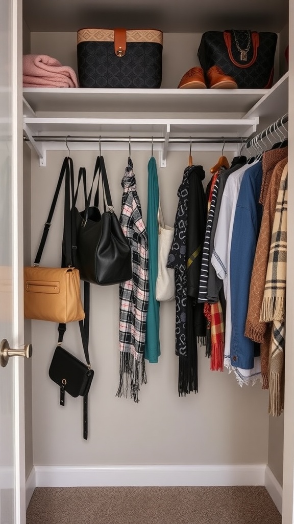Hooks are great for hanging bags, scarves, and hats. In this closet, you can see several bags neatly hung up, making them easy to grab when you’re getting ready. This way, your favorite accessories are always within reach.