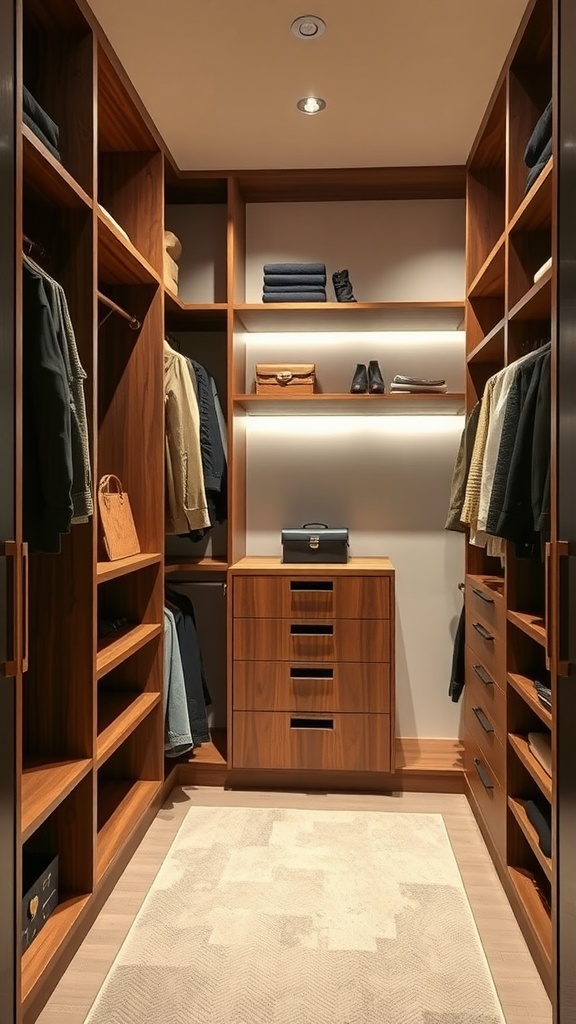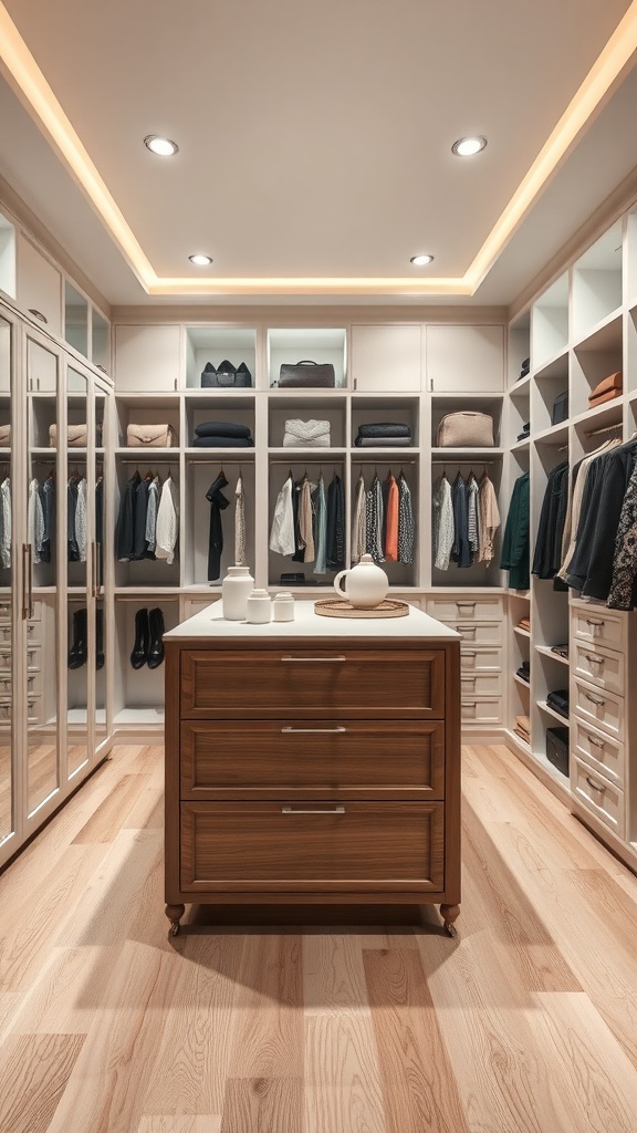 Island storage can truly transform your walk-in closet experience. Imagine a stylish centerpiece that not only adds to the aesthetic but also boosts functionality. The image shows a beautifully organized space featuring a wooden island that neatly houses drawers for smaller items. This clever feature allows you to easily access essentials right at the center of your wardrobe.