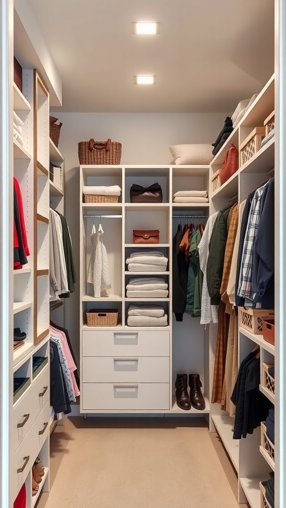 Decorative boxes can be a lifesaver in any walk-in closet. They add style while keeping your items organized. In the image, we see a well-arranged closet featuring various boxes that enhance the overall look.