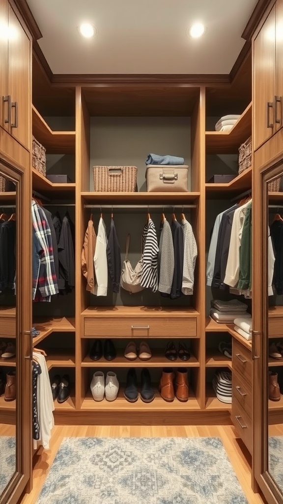 When designing a walk-in closet, think about how to make the most of your space. This image shows a well-organized closet that doubles as a workspace. The natural wood cabinetry provides a warm feel, while the layout offers easy access to clothes and accessories.