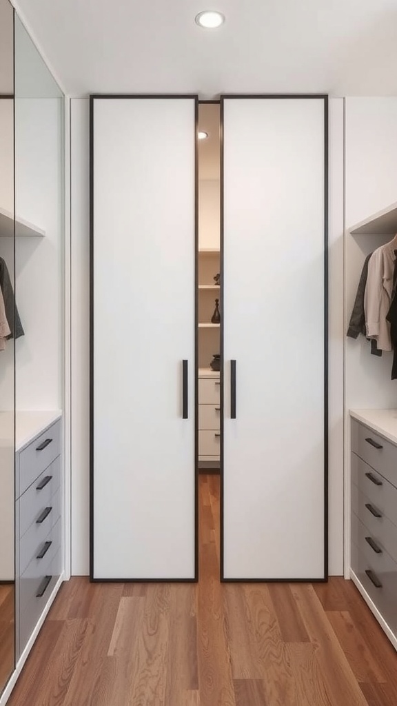 Sliding doors are a fantastic way to make your walk-in closet feel more spacious and organized. The image shows a sleek design with a clean, modern look. These doors slide open effortlessly, saving valuable space that swinging doors would occupy.