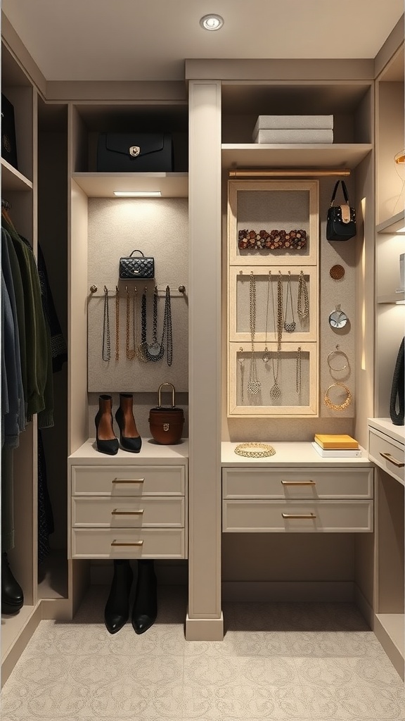 A well-organized closet can make a world of difference, especially when it comes to showcasing your favorite pieces. In the image, you can see a stylish closet featuring dedicated jewelry organizers that add not just order, but also flair. The display of necklaces, bracelets, and rings is done in a way that transforms storage into a visual treat.