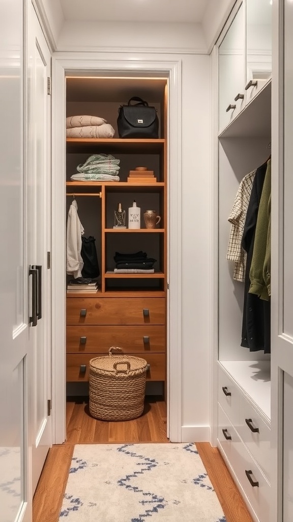 A wicker basket sits at the base, perfect for stashing miscellaneous items, adding warmth to the space. Such creative storage options can turn a cluttered closet into a serene retreat.
