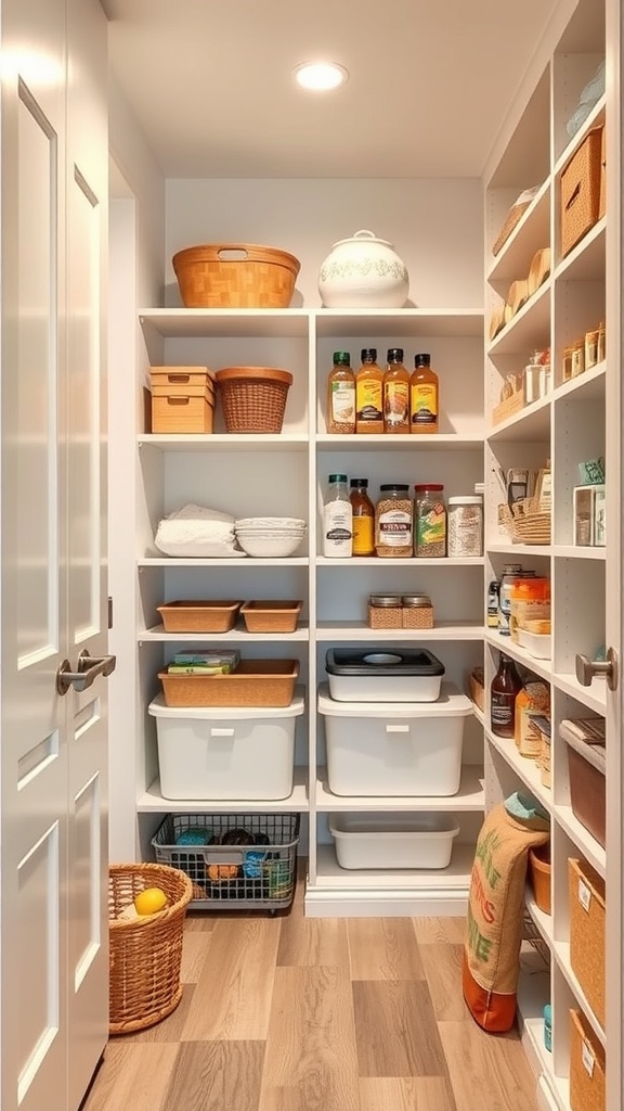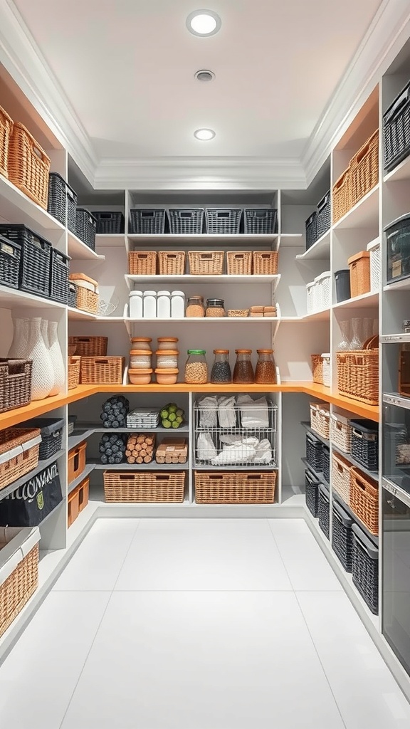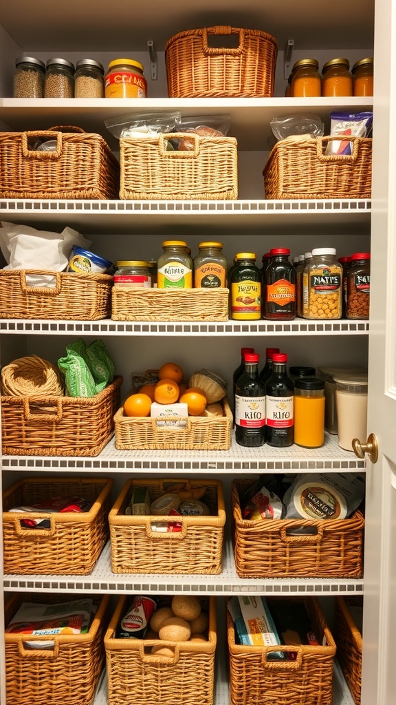 Baskets are a fantastic way to organize your pantry. They come in various sizes and styles, making them perfect for storing everything from snacks to fresh produce. In the image, you can see a well-organized pantry with baskets neatly arranged on the shelves. Each basket holds different items, creating a tidy and visually appealing space.