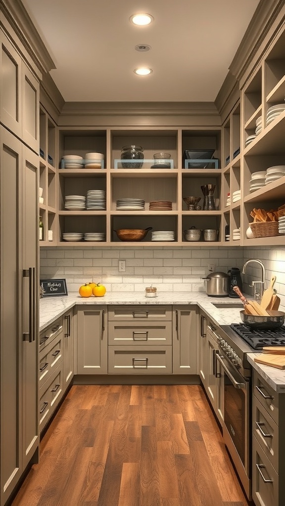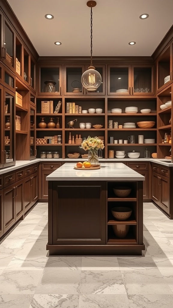 A pantry island can be a fantastic addition to your walk-in pantry. It provides extra workspace for meal prep and organizing your kitchen essentials. In the image, you can see a beautifully designed pantry with a central island that enhances functionality.