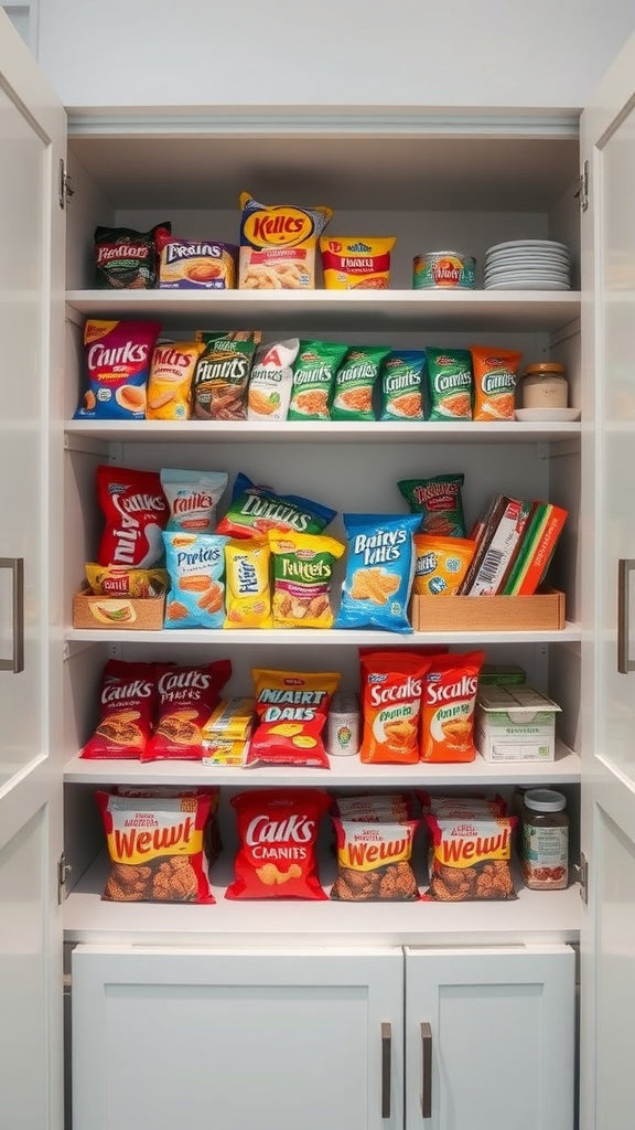 A well-organized pantry can be a game changer, especially when it comes to snacks. The image shows a spacious pantry with shelves filled with various snack options. From chips to cookies, everything is neatly arranged for easy access.