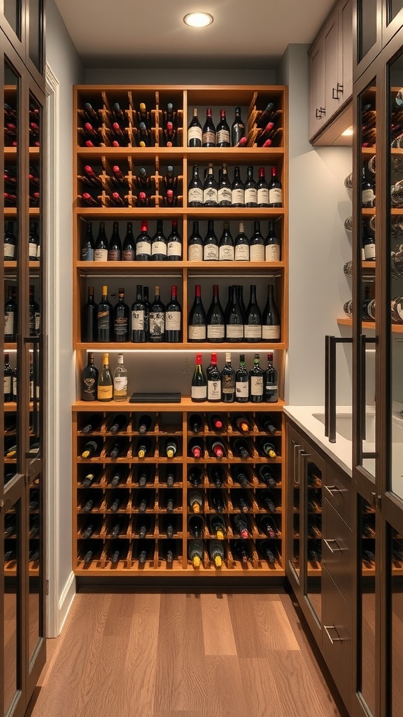The image shows a well-designed wine rack that maximizes space. With various shelves holding different types of wine, it’s perfect for both casual drinkers and wine enthusiasts. The wooden finish adds warmth, making the pantry feel inviting.