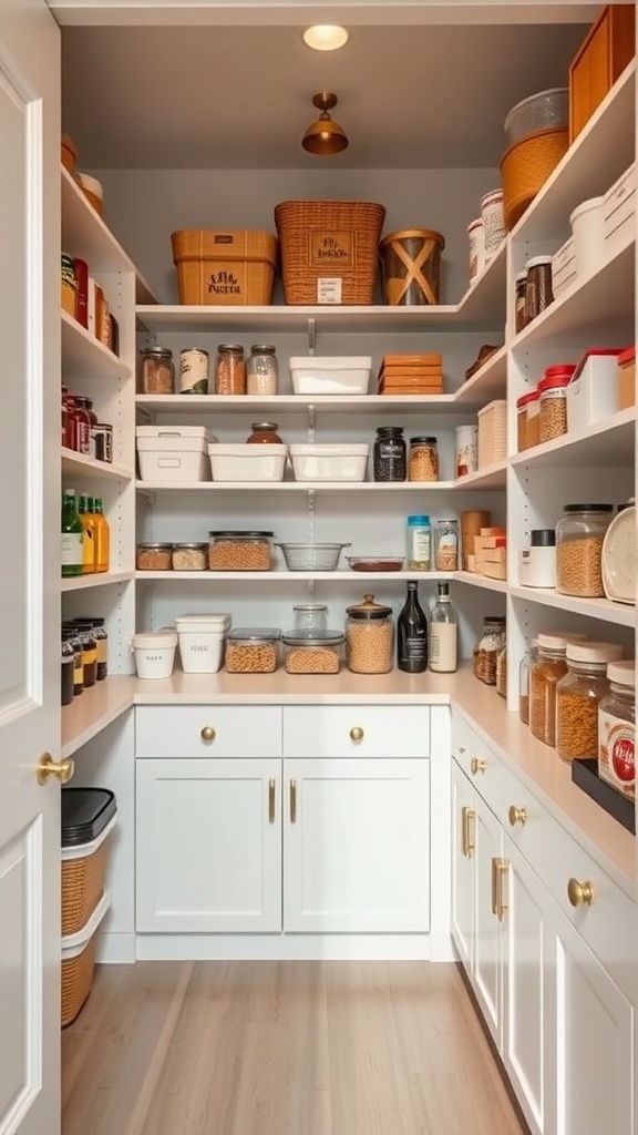 Notice the use of baskets and clear containers. These not only look great but also make it easy to find what you need. Labeling jars and baskets can save time when you’re in a hurry. It’s all about making your pantry functional and stylish.