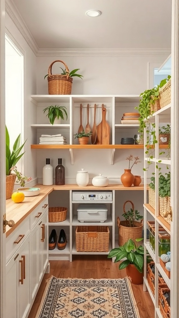 The design features open shelving that allows for quick access to items. You can see jars, baskets, and containers that keep things tidy. This setup not only looks good but also promotes efficiency when cooking or preparing meals.